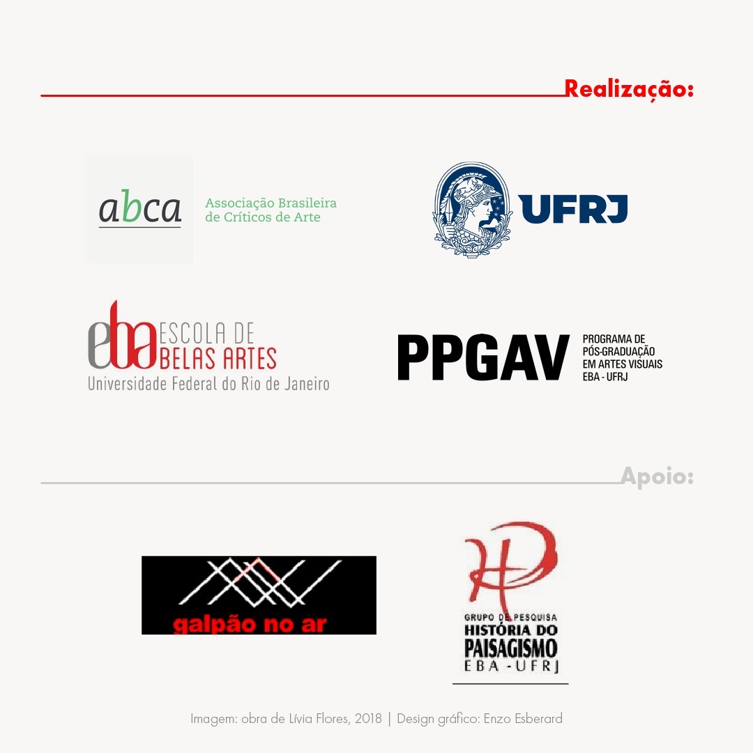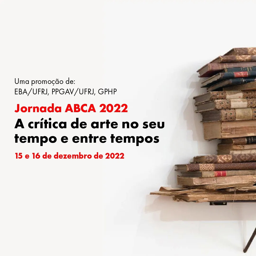 A Escola de Belas Artes da UFRJ, juntamente com seu Programa de Pós-Graduação em Artes Visuais (PPGAV), com o apoio dos Grupos de Pesquisa Paisagens Híbridas (GPPH) e História do Paisagismo (GPHP), sediará a Jornada da Associação Brasileira de Críticos de Arte (ABCA) em 2022. Pelas dificuldades encontradas neste primeiro ano de gestão da ABCA, optamos por fazer um evento sucinto, em formato on-line, nos dias 15 e 16 de dezembro, com transmissão pelo YouTube. O encontro contará com oito comunicações, distribuídas em quatro diferentes mesas, seguidas de debate.