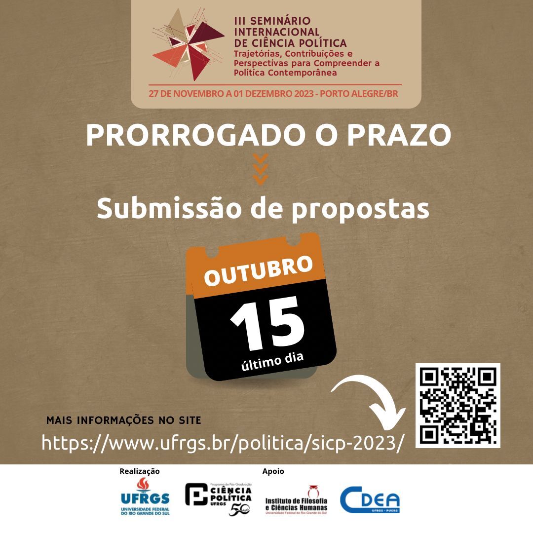 Prorrogação do prazo para submissão de trabalhos até 15 de outubro de 2023 no III Seminário Internacional de Ciência Política, que ocorrerá em Porto Alegre-RS, entre os dias 27 de novembro e 01 de dezembro de 2023.